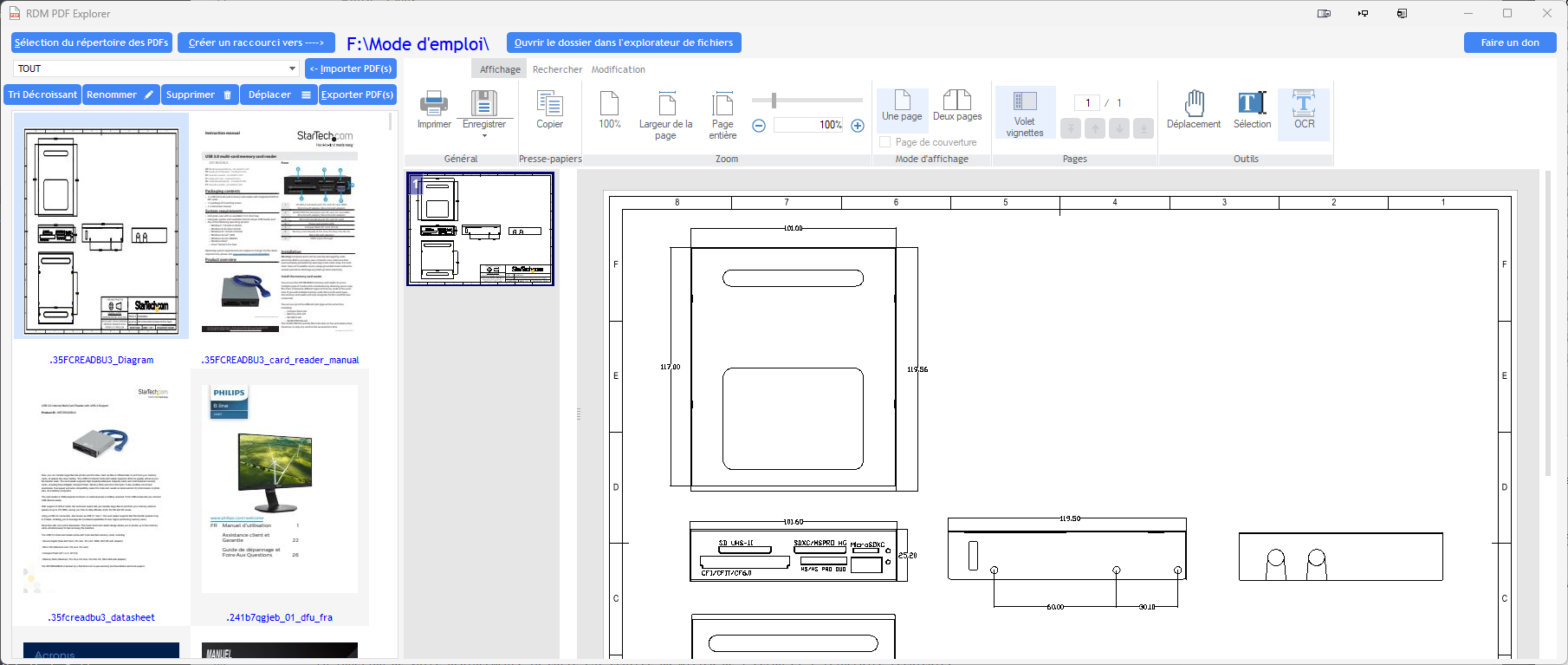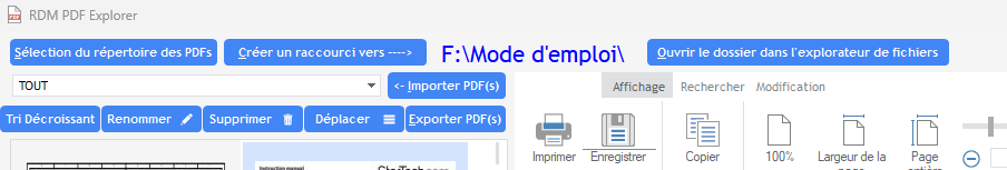 * Sélection du répertoire des PDFs : Pour choisir le répertoire racine des PDFs dans l'exemple F:\Mode d'emploi\. * Selection of the PDFs directory: To choose the root directory of the PDFs in the example F:\Mode d'emploi\.